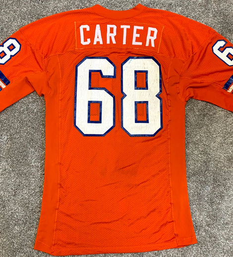 This jersey was worn by Rubin Carter during the 1986 season. It shows great use with hit marks and paint transfers.